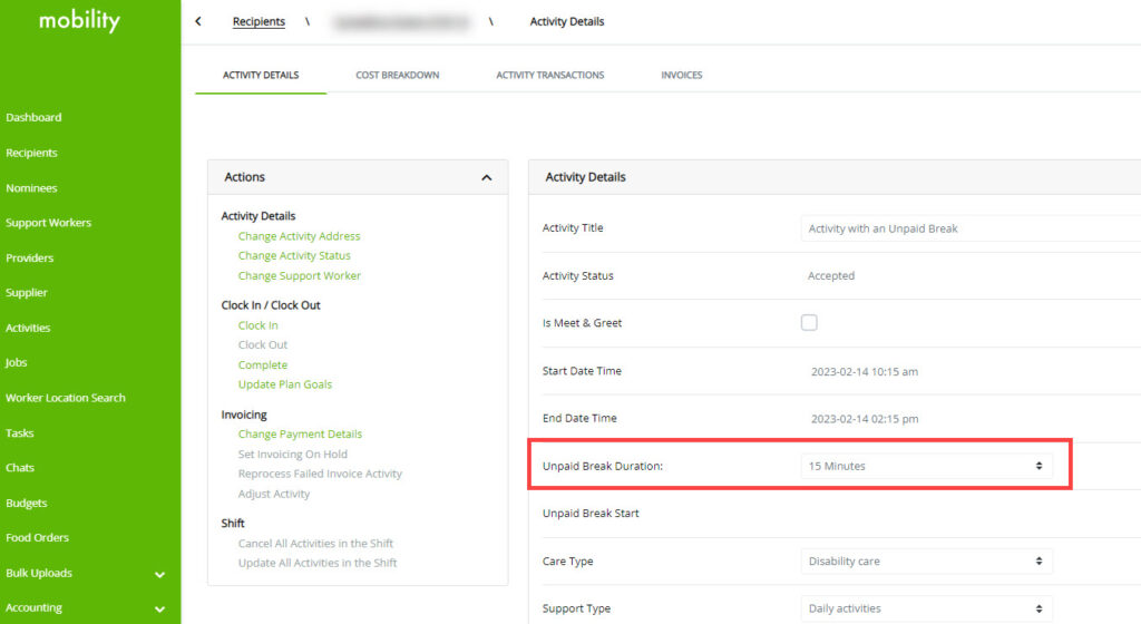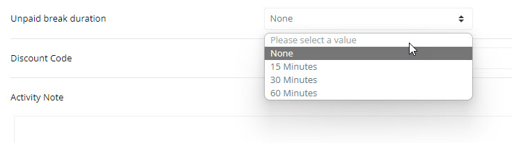 • Unpaid breaks have been added as an option for any activity with a duration that exceeds 1 hour.