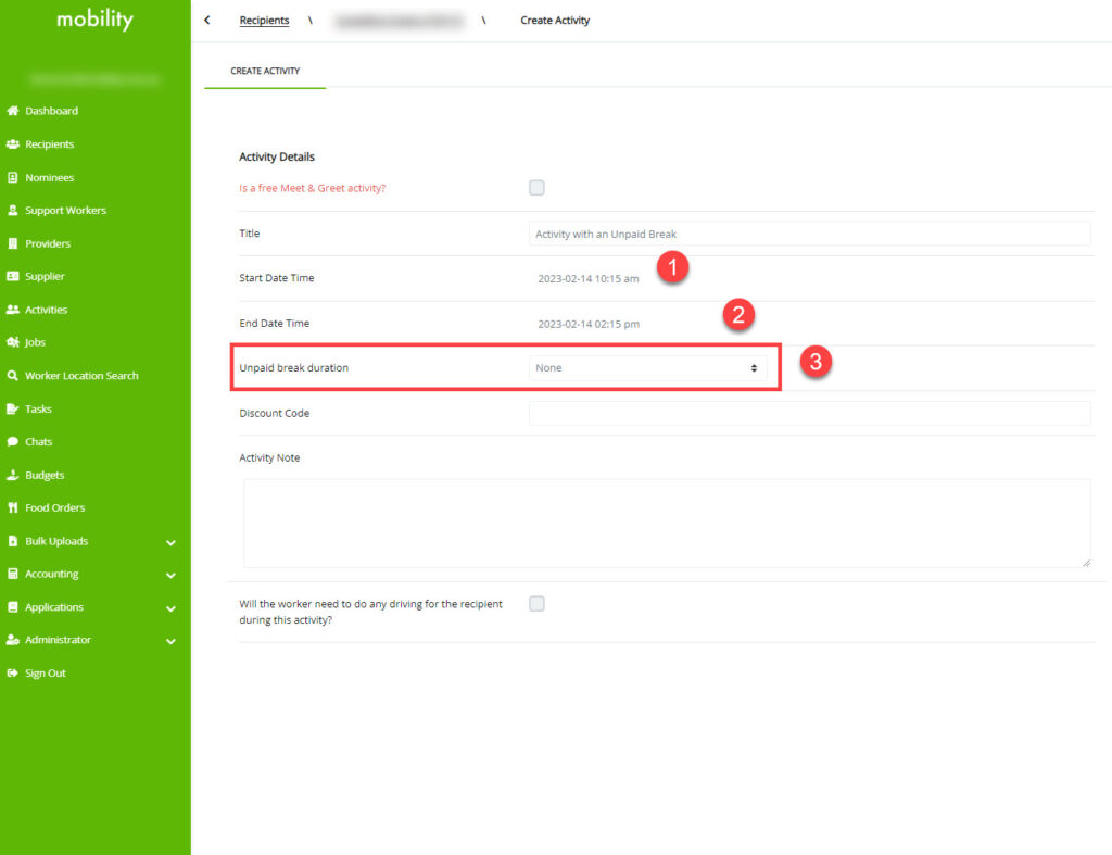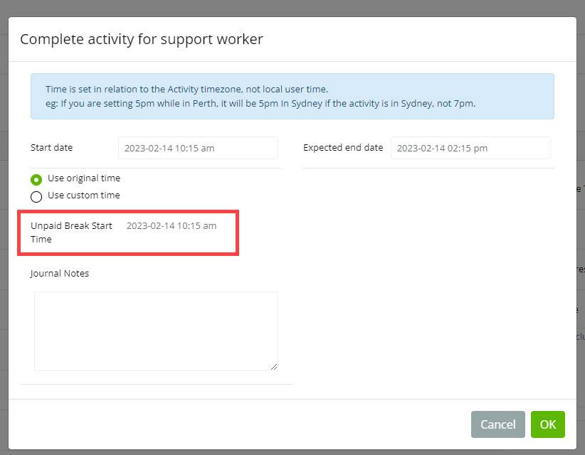 When completing an activity with an unpaid break included, you must select the Start Time of the break, on behalf of the Worker.