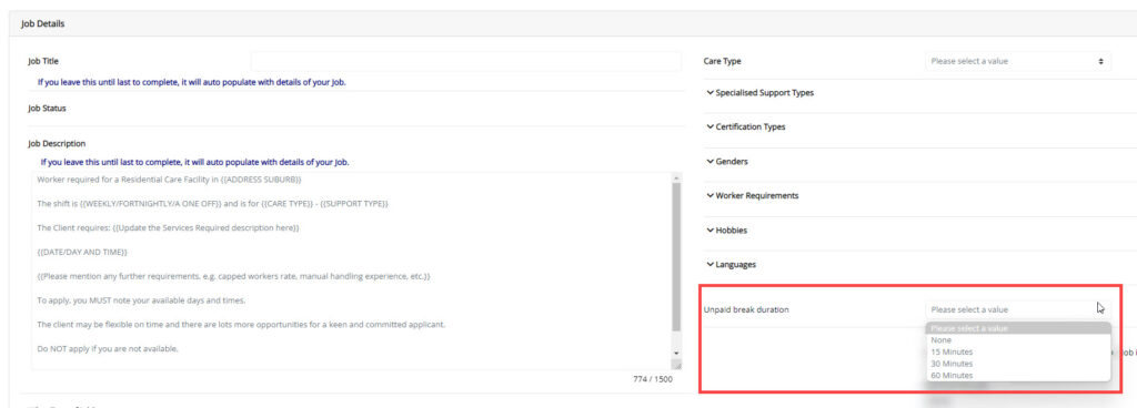 Any activity or shift created from this job, will automatically apply the unpaid break duration to that booking.